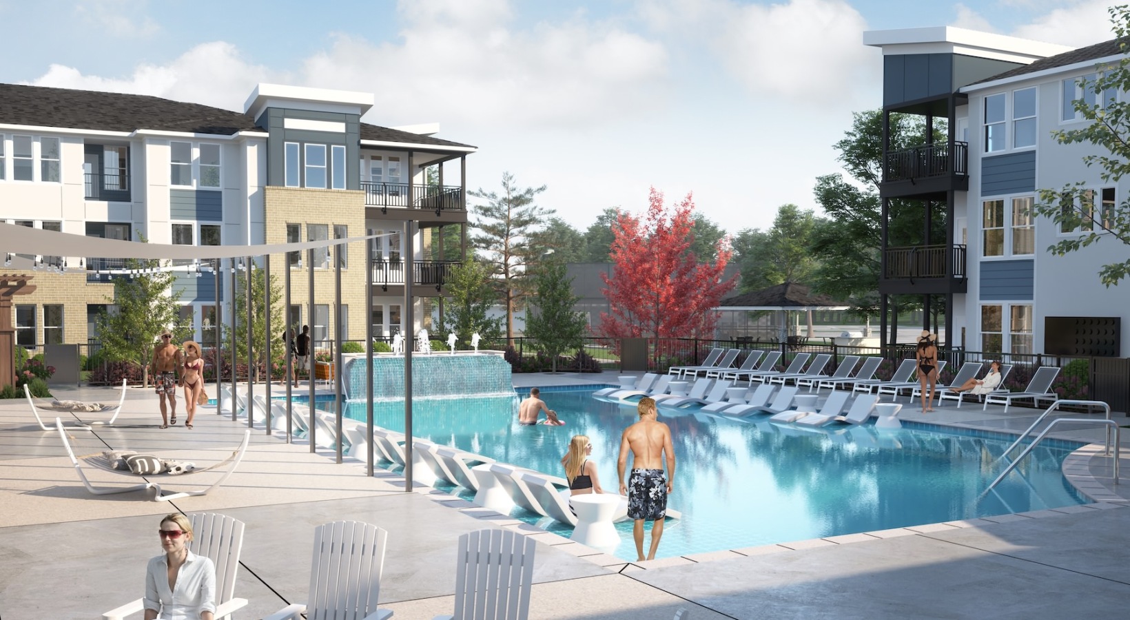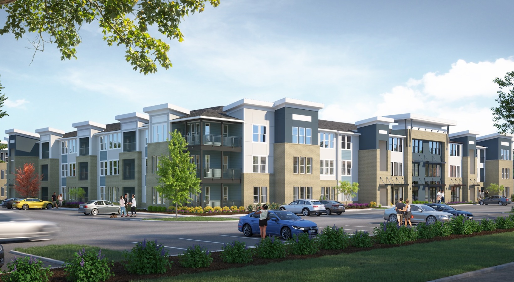 • exterior rendering of a multi-story building with a large parking lot