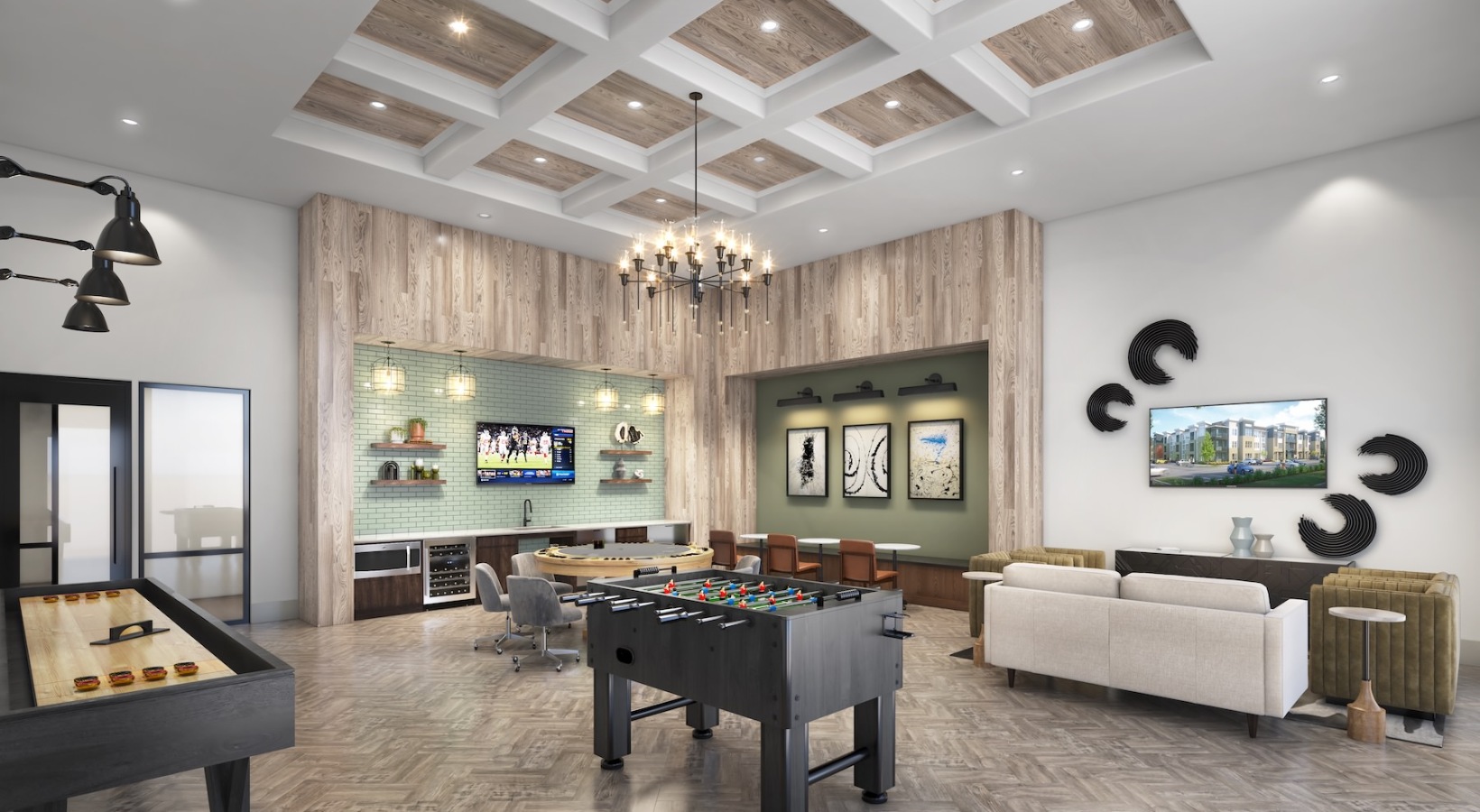 • clubhouse with game area and seating options and a tv on the wall